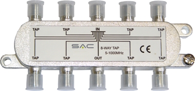 8 way tap. 20dB. Class A shielded. All ports 'F' terminals. Zinc die cast housing with a nickel plating. Features integral grounding terminal. Comes complete with 2 fixing screws.